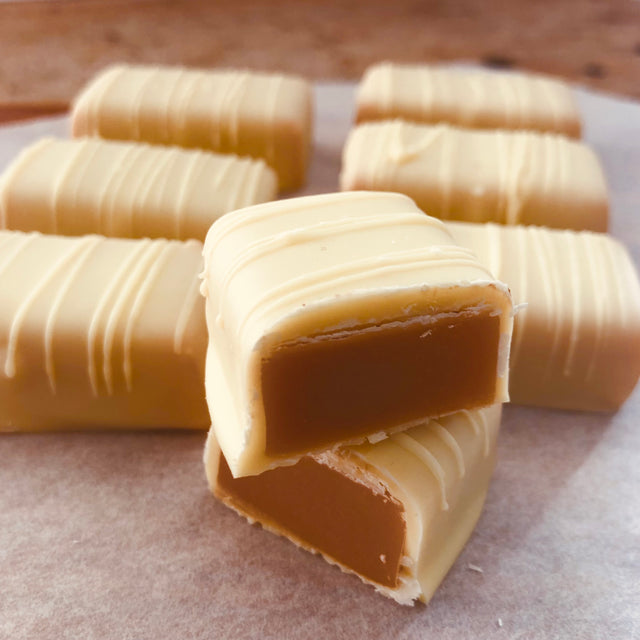 Our Lemon Caramel is made with butter and cream delicately flavoured with lemon and dipped in white Belgian chocolate.